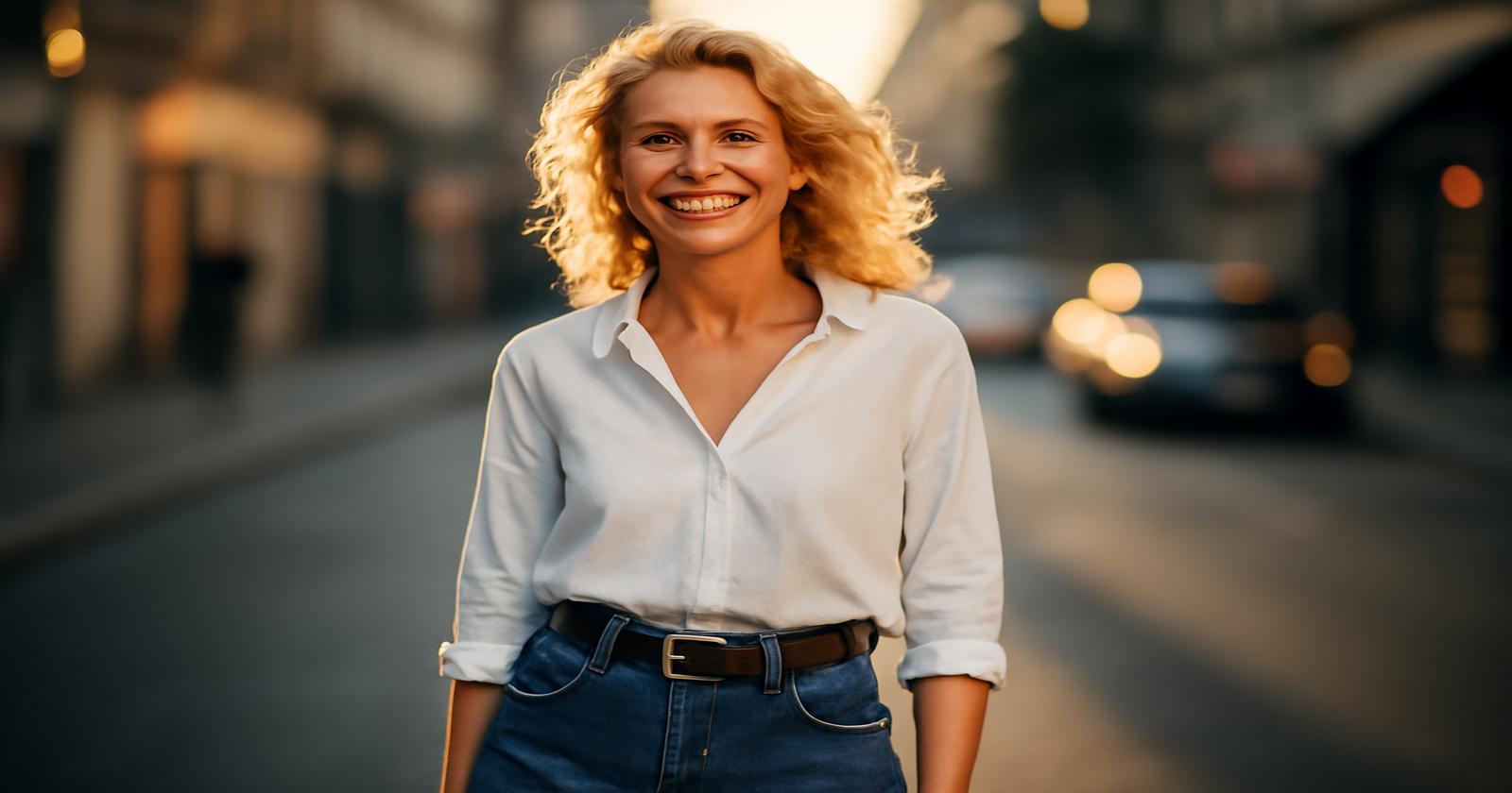 Später, wenn die Sonne höher steht, reicht ein kleiner Wechsel, um denselben Jeans-Schnitt in etwas völlig Neues zu verwandeln: Das T-Shirt wird gegen eine Seidenbluse in sanftem Creme getauscht, der Trench gegen eine kurze, leicht kastige Jeansjacke oder einen Blazer mit gerader Schulter. Plötzlich wirkt die Retro-Jeans nicht mehr nur entspannt, sondern überraschend elegant, fast wie die Basis eines modernen City-Outfits.
